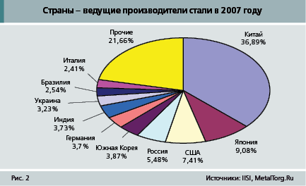 На конец 2007 г. уровень запасов стальной продукции в большинстве стран мира (кроме ЕС) был близок к нормальному. Причем металлургия мира все менее готова работать на склад. Спрос практически не отстает от предложения, поэтому оценка MetalTorg.Ru по приросту потребления стали в мире (около 7,2%) заметно выше прогнозов IISI (рис. 2).