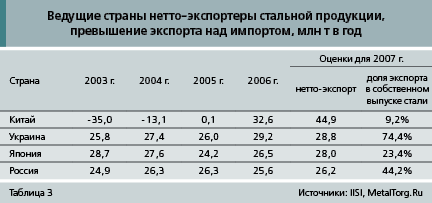 дополнить информацией в полном объеме за 2007 г. еще долгое время не представится возможным. Однако по ряду ведущих стран и регионов некоторая ясность уже есть. Китай, вопреки многим заверениям, не смог в 2007 г. умерить темпы вывоза стальной продукции. По оценкам, он вырастет до 62 млн т (более 15% мирового экспорта). Некоторые позитивные тенденции снижения просматриваются только в ноябре–декабре.