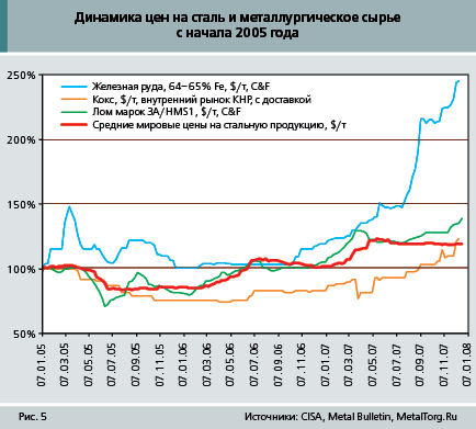 C середины 2007 г. металлургическое сырье в мире уверенно начало новый виток роста цен, в то время как стальной рынок находится в стагнации. Сохраняется избыточное производство в мировой черной металлургии при нарастающем дефиците горнорудного сырья и металлолома.