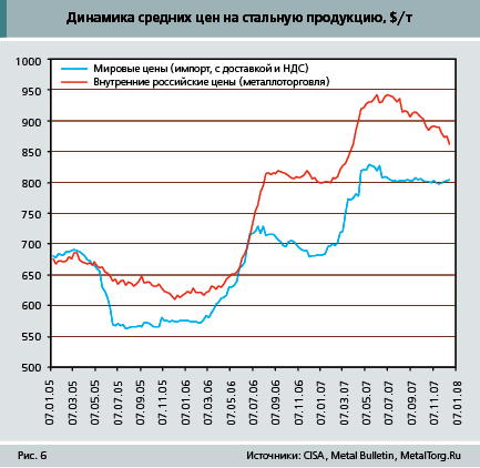 Прежде всего – за счет дефицита и роста цен металлопроката строительного назначения (стальной арматуры и т. д.). Весной 2007 г., судя по ценам, ситуация почти повторилась. Однако конъюнктура этого рынка была совсем иной. Производители, импортеры и трейдеры создали избыточные складские запасы «ходовой» металлопродукции. В результате этого спад российских стальных цен, начавшийся летом, не прекратился до самого Нового года.