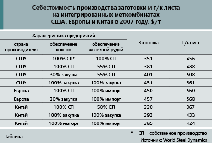 В итоге, согласно данным World Steel Dynamics, в 2007 г. на интегрированных комбинатах Китая, обеспечивающих себя собственной железной рудой на 50–55% и на 100% – коксом, себестоимость производства слябов и блюмов составила $330 за т, тогда как в США – минимум в $381 за т. Предприятия со 100%¬й закупкой ЖРС в прошлом году вышли на себестоимость $450–457 за т заготовки в США и ЕС, а в Китае – на $385–393 за т (табл. 1).