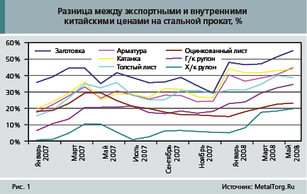 Наибольший разрыв между китайскими внутренними и экспортными ценами наблюдаются в сегменте заготовки, катанки и арматуры, который с января 2008 г. резко увеличился, а в мае достиг 44–55% (заметно превысив экспортные пошлины в 20–25%).
