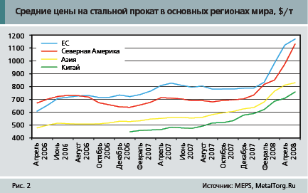 При этом внутренние цены на китайский прокат с начала года увеличились в среднем на 29% (в основном за счет расходов на сырье, электроэнергию и транспорт), а цены для экспорта – на 37%. Постепенный рост стальных цен на рынке Китая в 2008 г. заметно отстает от мировой динамики. Их уровень не просто по-прежнему остается заметно ниже мирового уровня цен (рис. 2) – разрыв явно вновь нарастает.