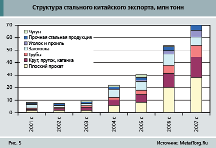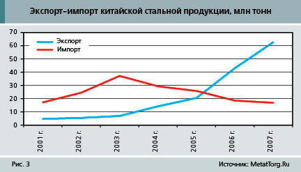 Несколько лет назад китайские метпредприятия весьма увлеклись выгодным экспортом стальной продукции. В 2006 г. Китай превратился из мирового лидера по импорту стали в одного из ведущих ее экспортеров. А в 2007 г. страна возглавила список экспортеров стали. В прошлом году экспорт стальной продукции из Китая составил 62,6 млн т, что выше уровня 2001 г. в 12 раз. В последние годы темпы прироста экспорта варьировались от 15 до 46%, однако наибольшие пики роста пришлись на 2004 г. (105%) и 2006 г. (110%), после чего Китай и стал неттоэкспортером стальной продукции. При этом неттоэкспорт (превышение экспорта над импортом) в 2006 г. составил 24,5 млн т, а в 2007 г. – уже 45,8 млн т.