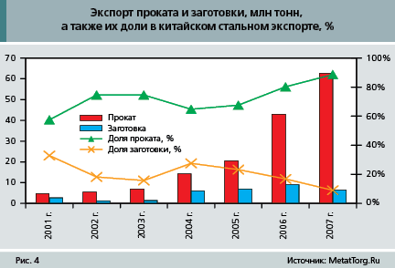 В текущем году тенденция сокращения вывоза китайской заготовки еще более усугубилась. С введением таможенной пошлины на эту продукцию в 25%, поставки стальных полуфабрикатов на внешний рынок за январь–апрель 2008 г. упали на 96% по сравнению с аналогичным периодом 2007 г., до 0,1 млн т, а их доля в экспортной товарной структуре составила всего 1% (в январе–апреле 2007 г. – 11%). При этом доля проката выросла на 10%, до 97%.
