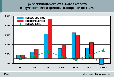 Власти КНР, не желая проблем в международной торговле, с 2006–2007 г. особо сосредоточены на сокращении экспорта стальной продукции, особенно с низкой добавленной стоимостью, производство которой серьезно загрязняет окружающую среду, требует высоких затрат энергии и ресурсов. Поскольку уговоры на металлургов и экспортеров практически не подействовали, начались «карательные меры». С апреля 2007 г. Китай снизил ставки на возврат налога при экспорте черного металла, а через два месяца ввел в действие новые экспортные пошлины на 83 вида готовой продукции в размере 5–10%, причем на полуфабрикаты – 15%. С января 2008 г. пошлина на вывоз из страны стальной заготовки выросла до 25%.