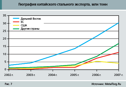 Отметим, что РФ с 2002 г. увеличила импорт стали из Китая в 93 раза. Так, если еще 6–7 лет назад Россия покупала не более 10,5 тыс. т китайского металла, то в 2007 г. – уже почти 1 млн т (т. е. 961,564 тыс. т).