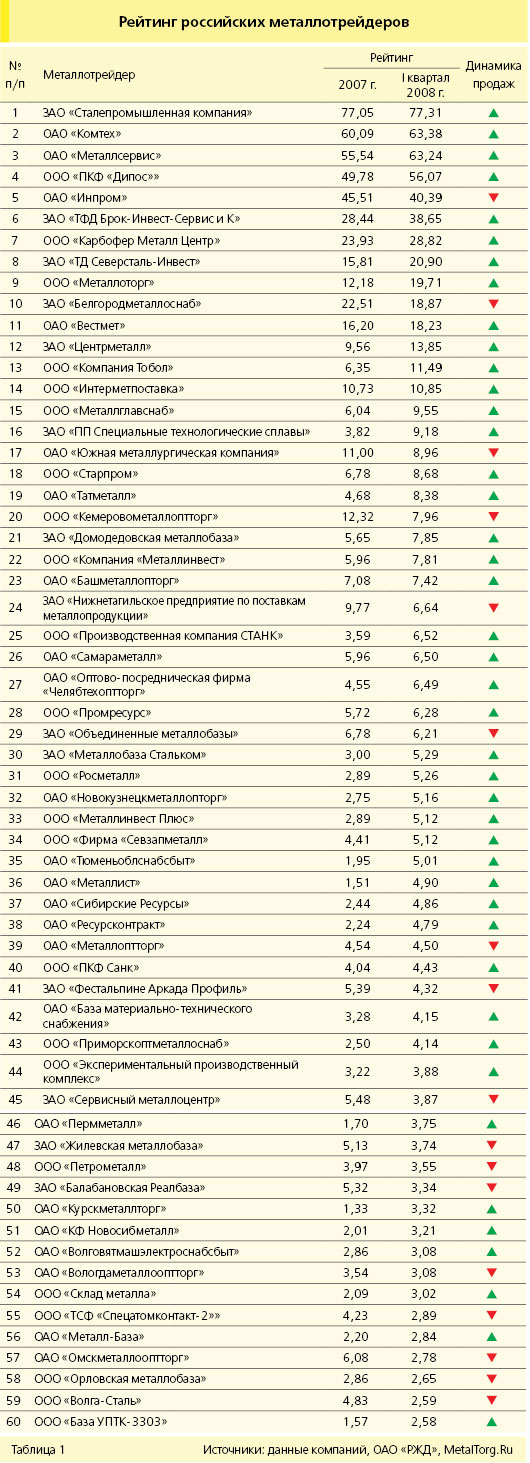 Отметим, что поставки по прямым договорам покупателей с заводами оказываются неучтенными в рейтинге металлоторговли. К примеру, если учесть, что ТД «Северсталь-Инвест» в 2007 г. поставил по таким договорам более 700 тыс. т металла, то его позиция в рейтинге могла бы переместиться в первую тройку металлотрейдеров. Однако организация подобных поставок (фактически – услуг) не может быть учтена практически. Позиции в рейтинге (табл. 1) в наибольшей степени соответствуют закупкам металла трейдерами и их отгрузкам с собственных складов.