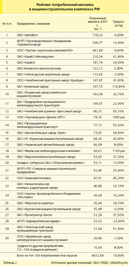 Крупнейшие 30 потребителей металлопродукции в российском машиностроении и средние данные по топ-100 отрасли приведены в табл. 2.