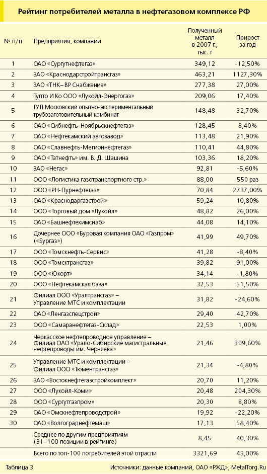 Рост для топ-100 (около 43% за 2007 г.) также не слишком впечатляет, поскольку малые и средние предприятия сократили закупки металла. На начало 2008 г. нефтегазовый комплекс РФ потребляет около 14% металла в стране. Это весьма немного на фоне больших финансовых ресурсов отрасли. Инвестиции в ТЭК остаются невелики, что ставит под сомнение его развитие.