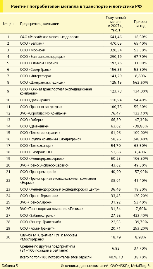 Крупнейшие 30 потребителей металлопродукции в отрасли транспортных услуг и средние данные по топ-100 отрасли приведены в табл. 5.