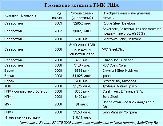 Далее в США последовали новые приобретения, причем в борьбу за американские металлургические активы включились и другие российские холдинги (табл. 1).