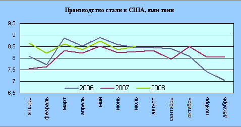 Ситуация в стальной отрасли США сейчас оставляет желать лучшего. Спрос на сталь в связи с кризисом экономики США продолжает оставаться низким. Однако общее производство стали в стране остается близким к темпам прошлого года, и даже лучшим, чем во второй половине 2006 г. (рис. 1). Цены на сталь в США остаются много выше среднемирового уровня, причем рынок огражден целым набором таможенных пошлин и квот.