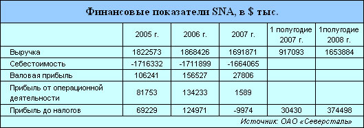 Напомним, что в 2007 г. SNA показала неутешительные результаты, снизив показатели рентабельности всей группы «Северсталь». Именно из-за зарубежных активов «Северстали» рентабельность компании по EBITDA составила только 24%, заметно отстав от аналогичных показателей других российских производителей – НЛМК, ММК и «Евраза».