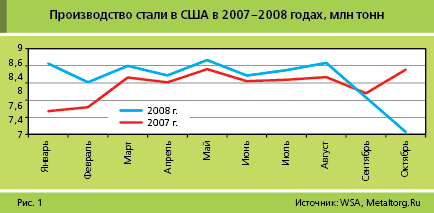 Производство стали в стране за сентябрь–октябрь снизилось на 1,61 млн т, т. е. почти на 23%. Причем в ноябре эта тенденция продолжилась. К примеру, за неделю с 9 по 15 ноября 2008 г. выпуск стали упал еще на 10,1%, а производственные мощности использовались всего на 58,7%. Реализация продукции упала еще заметнее, невзирая на то, что американский стальной рынок защищен от дешевого импорта многочисленными таможенными ограничениями.