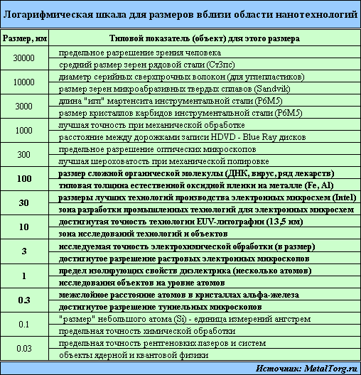 Чтобы прояснить, с какими объектами оперируют сейчас нанотехнологии, приведем таблицу с уменьшающейся шкалой характерных размеров.