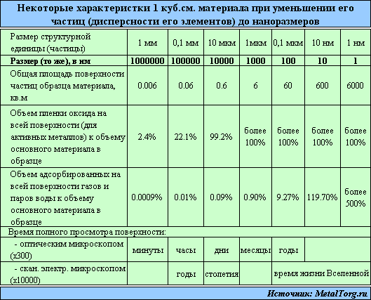 Данные таблицы 2 надо несколько пояснить. Квадратичный рост общей поверхности с уменьшением размеров частиц наноматериала очевиден. Менее известно, что все металлы (и реальные конструкционные материалы) сразу адсорбируют на поверхности мономолекулярный слой паров воды, кислорода или иных газов. Для наноразмеров частиц (в несколько атомов) эта «грязь» начинает превышать объем и массу самого исходного материала.