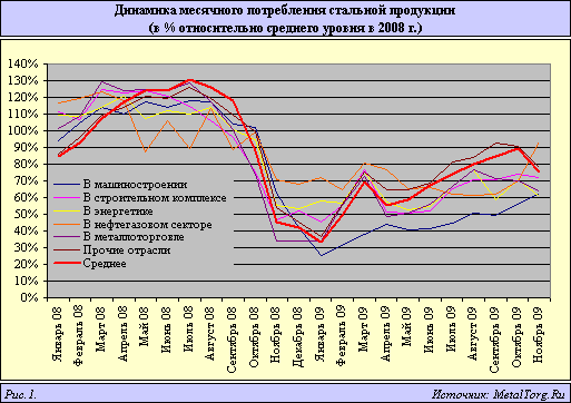 Динамика восстановления стального рынка России в прошедшем году, т. е. после самой острой стадии кризиса, в целом, безусловно, является позитивной. Однако идет этот процесс совсем не гладко (рис. 1).