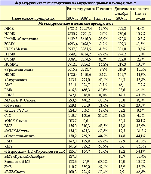 В части выпуска стали WSA показала в России за 2009 г. спад на 12,5%, а наш Росстат – на 13,9%. Однако перевозки всех черных металлов в РФ (исключая лом) на экспорт и на внутренний рынок, по данным ж/д статистики, упали заметно сильнее – на 18,45%. Этот показатель мы считаем более характерным, поскольку речь идет именно об основных отгрузках товарной продукции (полуфабрикаты, прокат и трубы) ее потребителям в России и за рубежом. Доля других отгрузок, например водным транспортом (в навигацию) ЧерМК «Северстали» или автотранспортом местным потребителям, плавно растет, однако до сих пор н... ... ...