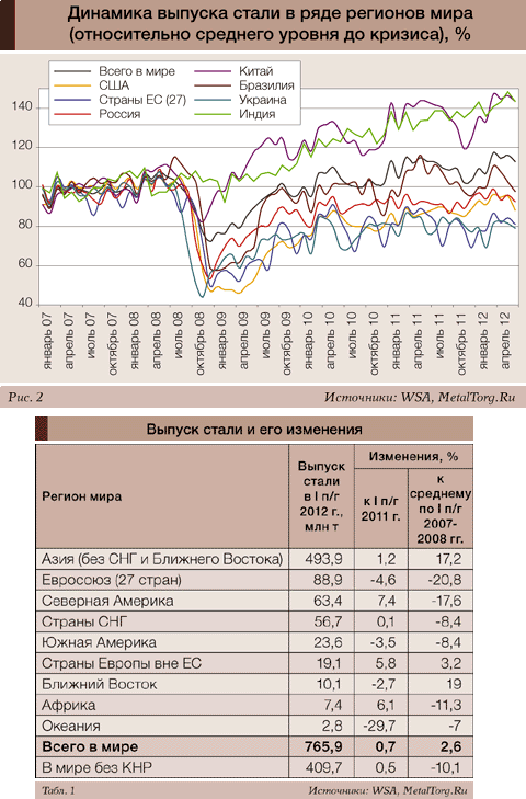 Благодаря Китаю и Индии Азиатский регион держит лидерство как по абсолютным показателям, так и по динамике их роста. В то же время металлурги ЕС с трудом удерживаются на уровне 80% от собственного докризисного выпуска стали. В США ситуация чуть лучше, но и там показатели 2007–2008 гг. остаются несбыточными мечтами.