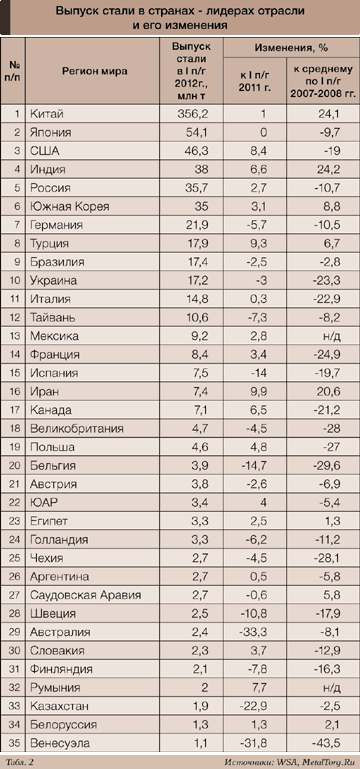 Хотя на фоне огромных объемов производства стали в КНР достижения Индии по динамике развития несколько меркнут. Китай выпустил 356 млн т только за первое полугодие 2012 г.! Причем докризисные показатели производства были им пройдены еще в начале 2009 г.