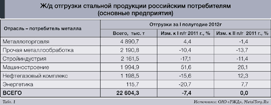 Годовой рост на 4,4% для металлотрейдеров, распределяющих металл множеству потребителей, стал для рынка плохим утешением. Сбыт стальной продукции металлоторговлей за последние полгода все равно упал на 1,4%. (табл. 1)