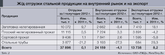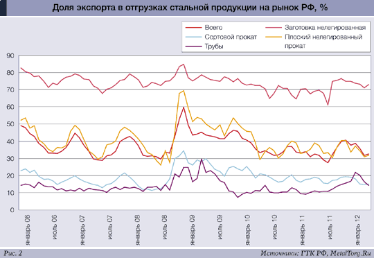 В итоге реальную долю сталь-ного экспорта из РФ к концу первой половины 2012 г. можно считать приблизившейся к 35–40% общего объема производства (рис. 2).
