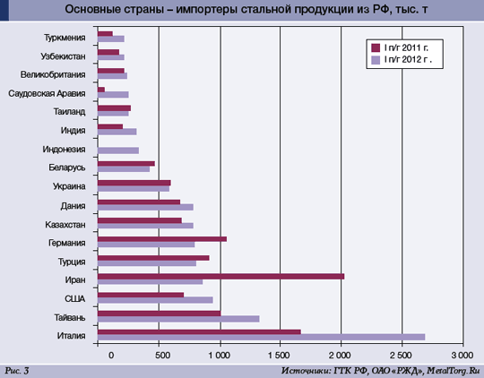 Среди списка основных покупателей российской стальной продукции в последние годы выделяются Иран, хотя экспорт в него по итогам полугодия сократился на 58%, и Италия, отгрузки в которую, наоборот, выросли на 61% (рис. 3). Кроме того, в тройку импортеров в 2012 году ворвался Тайвань.