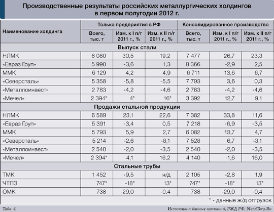 Отметим сразу, что картина остается прежней – существенный рост выпуска стали и продаж проката в последние два полугодия наблюдается только у группы НЛМК (табл. 4).