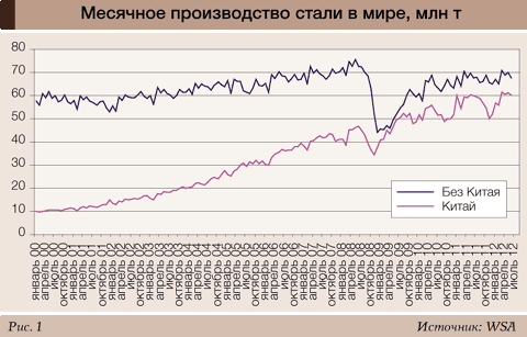 Новейшая история мирового стального рынка уже очевидно делится на «докитайскую» и «китайскую». Причем мировой кризис ускорил это разделение, но принципиально ничего нового не создал. Впрочем, до последнего времени мировым его можно назвать с натяжкой – в Китае спад производства был и небольшим, и недолгим (рис. 1).