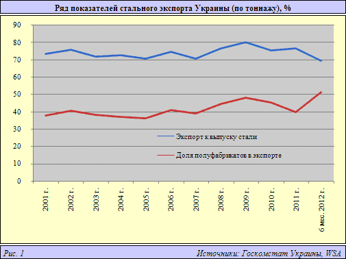 Некоторые позитивные тенденции украинского стального рынка в 2011–2012 гг. (небольшой рост внутреннего потребления) в последнее время нивелируются ухудшением структуры экспорта. Вновь начался рост доли вывоза самой недорогой стальной продукции – стальных полуфабрикатов, хотя украинская статистика, в отличие от World Steel Association (WSA), уверяет в обратном. Но и она вынуждена признавать ряд негативных тенденций. К примеру, за июль 2012 г. экспорт стальных полуфабрикатов с Украины увеличился на 13,1%, до 852,36 тыс. т, составив за полгода более 6 млн т.