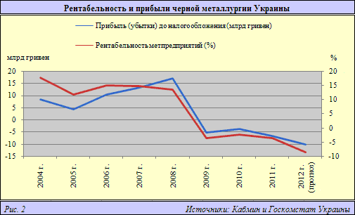 По недавней оценке аналитиков ИГ «Арт Капитал», за 7 месяцев 2012 г. доналоговый убыток металлургической отрасли Украины вырос в годовом исчислении в 15,4 раза, до 7,7 млрд гривен ($0,96 млрд), доход снизился на 14%, до 89,4 млрд гривен ($11,2 млрд), а отрицательная рентабельность просела с -0,5% до -8,3%.