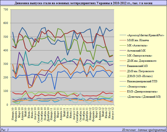 Эта «средняя температура по больнице» имеет однозначные исключения как по динамике прибылей, так и по объемам производства. В ГМК Украины объявляемые доходы/убытки металлургических предприятий крайне нестабильны уже многие годы и десятилетия. Однако слабые финансовые результаты заводов и комбинатов, как правило, почти не отражались на динамике фактических производств (рис. 3).