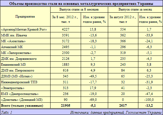 Август 2012 г. также не принес особого облегчения. По сообщению Государственной службы статистики Украины, в этом месяце объем металлургического производства и выпуска готовых металлических изделий в стране снизился на 12,5% в годовом исчислении.