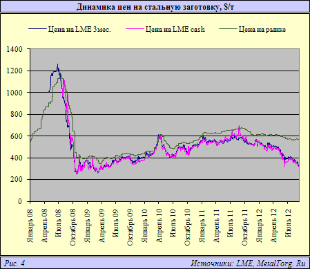Если до 2011г. биржевые цены на сталь в принципе соответствовали динамике рыночных котировок в мире (особенно с учетом налогов), то уже в текущем году это соответствие разрушилось. Стальные цены LME просто покатились вниз, как будто вторая волна кризиса не только надвигается, а уже раздавила мировую металлургию (рис. 4).