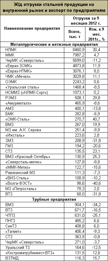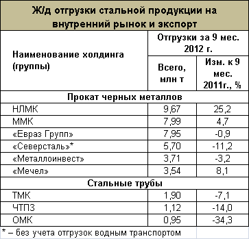 Самочувствие холдингов и металлургических комбинатов РФ при текущей рыночной конъюнктуре весьма различается. Динамика отгрузок российских холдингов по итогам 9 месяцев 2012 г. колеблется от позитивной (НЛМК, ММК, «Мечел») до весьма негативной (ОМК, ЧТПЗ).