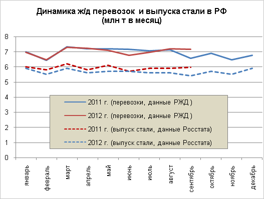 Динамика Росстата по производству стали в стране оказалась довольно близка к данным фактических ж/д отгрузок стальной продукции (рис. 1).