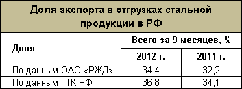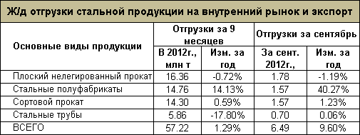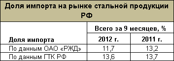 Отметим по обеим сводкам весьма позитивную тенденцию сентября 2012 г., когда выпуск стали в РФ вырос на 6% в годовом исчислении, а отгрузки стальной продукции – на 9,6%. Причем сентябрь переломил негативную тенденцию первой половины года и при отгрузках металла (включая импорт) российским потребителям (табл. 3).