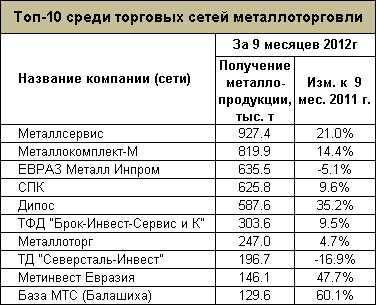 Группа «Металлоторговля» обеспечила в 2012 г. позитивную динамику потребления и дальнейших продаж металла как по итогам 9 месяцев, так и в конце сезона – в сентябре (+6,6% и +9,5% соответственно). Основной прирост обеспечили лидеры (см. табл. 4), причем в списке появились и новые имена.