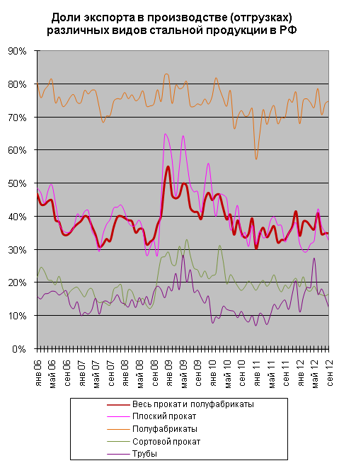 Основной поток в мощном российском экспорте по-прежнему составляют стальные полуфабрикаты. В 2012 г. за границу их вывозилось порядка 70–80% из общего объема продаж. А минимум экспорта (в среднем около 12% от производства) все также удается показывать российским трубным предприятиям (рис. 2).