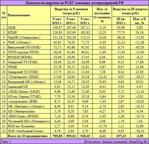 Начнем с ведущих (по объемам выручки) металлургических и трубных заводов РФ (табл. 1).