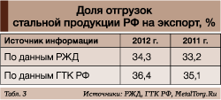 Основным направлением роста (+17,5%) в металлургии РФ за истекший год стало производство стальных полуфабрикатов (заготовок и слябов) на экспорт. По разным данным, за 2012 г. доля экспортных отгрузок на стальном рынке выросла на 1,2–1,3% (табл. 3).
