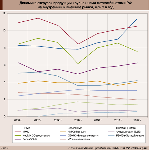 Крупнейший российский производитель арматуры – объединенный «Евраз ЗСМК» и производитель №2 – ЧМК «Мечел» за 2012 г. снизили ж/д отгрузки арматуры. Нижнесергинский метизно-металлургический завод (НСММЗ, «НЛМК-Сорт») увеличил отгрузки всего лишь на 8,24%. Существенно прибавили только второстепенные производства, обеспечивающие около трети выпуска арматуры в стране, особенно Ростовский электрометаллургический завод (РЭМЗ), Магнитогорский меткомбинат и Ревякинский металлопрокатный завод.