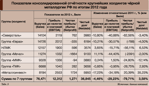 Ещё критичнее выглядит долговая нагрузка «Евраза» и «Мечела», показавших убытки по итогам года. Без реструктуризации долгов, включая российскую господдержку, эти группы выглядят финансово неустойчивыми, а их курс акций обвалился до минимума. Показатели МСФО за IV квартал 2012 г. внесли особо негативный вклад в финансы металлургических компаний, поэтому не слишком афишируются.