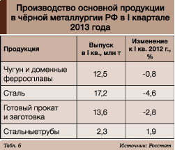 По данным Росстата, за I квартал выпуск стали и основной металлургической продукции в РФ, за исключением труб, заметно снизился (табл. 6).