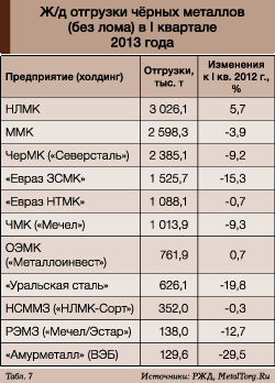 ОАО «РЖД» сообщило, что по итогам января–марта 2013 г. перевезло с меткомбинатов РФ 21,112 млн т чёрных металлов, что на 6,8% ниже объемов перевозок за аналогичный период прошлого года.