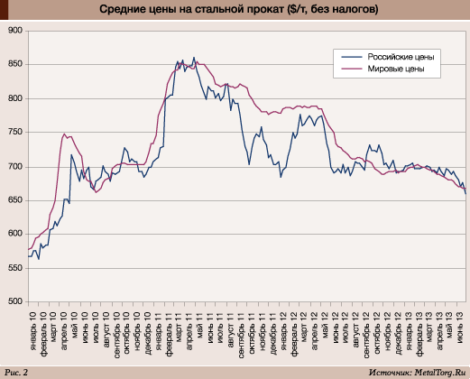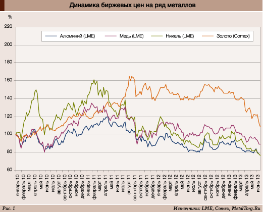 Курс доллара США и курс акций большинства американских компаний летом 2013 г. продолжили свой рост к новым рекордам. Но на прочих фондовых и товарных рынках мира, наоборот, почти все неуклонно падает и дешевеет. Рынок металлов и оценки металлургических компаний вновь на минимумах, причем весьма заметных.