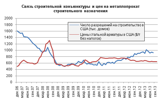 Стройиндустрия США после известного ипотечного кризиса 2007–2008 гг. находится на подъеме в течение последних полутора лет: растут продажи и цены недвижимости, а также число разрешений на новое строительство. Но при всем «американском позитиве» аналитики отмечают, что главные показатели отрасли (и рынка недвижимости) по-прежнему почти на треть и более ниже докризисного уровня. При этом никакой жесткой связи цен на стройматериалы, включая металл, с состоянием строи... ... ...