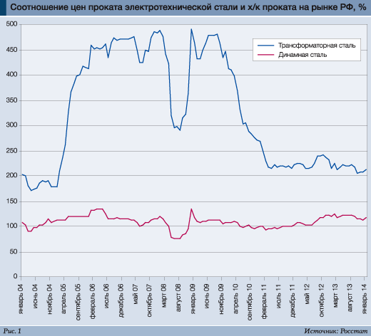 Два массовых вида электро-технической стали (динамная и трансформаторная) выпускаются в форме тонколистового плоского проката. Это специфическая (начиная с технологии выплавки стали) продукция, цены которой сравнительно высоки (рис. 1).