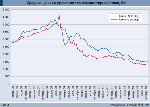 Сейчас благополучие российского производства электротехнических сталей прежде всего обеспечивает экспорт «ВИЗ-Стали» и НЛМК (на $180 млн и $72 млн в 2013 г. соответственно). Однако он в несколько раз ниже, чем в докризисные времена, причем сохраняет тенденцию спада.